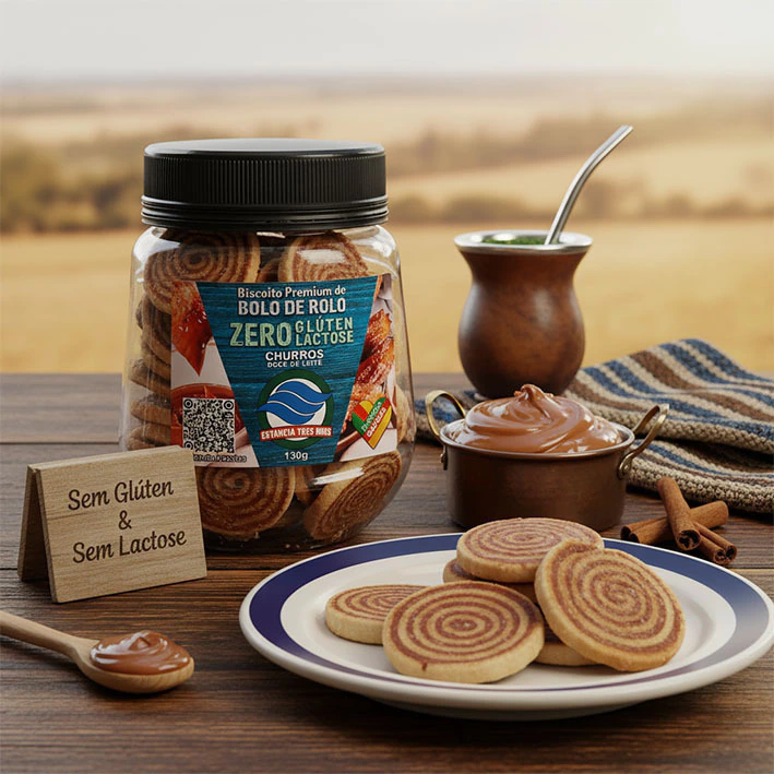 Prepare-se para se apaixonar à primeira mordida. Nosso biscoitinho de bolo de rolo sabor Churros Zero Glúten/Lactose é uma verdadeira joia da confeitaria artesanal: camadas finíssimas de massa amanteigada (sem lactoes) de verdade, delicadamente assadas até alcançar a crocância perfeita, envolvem um recheio generoso de doce de leite.